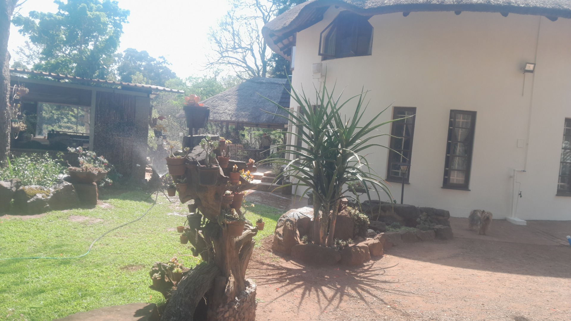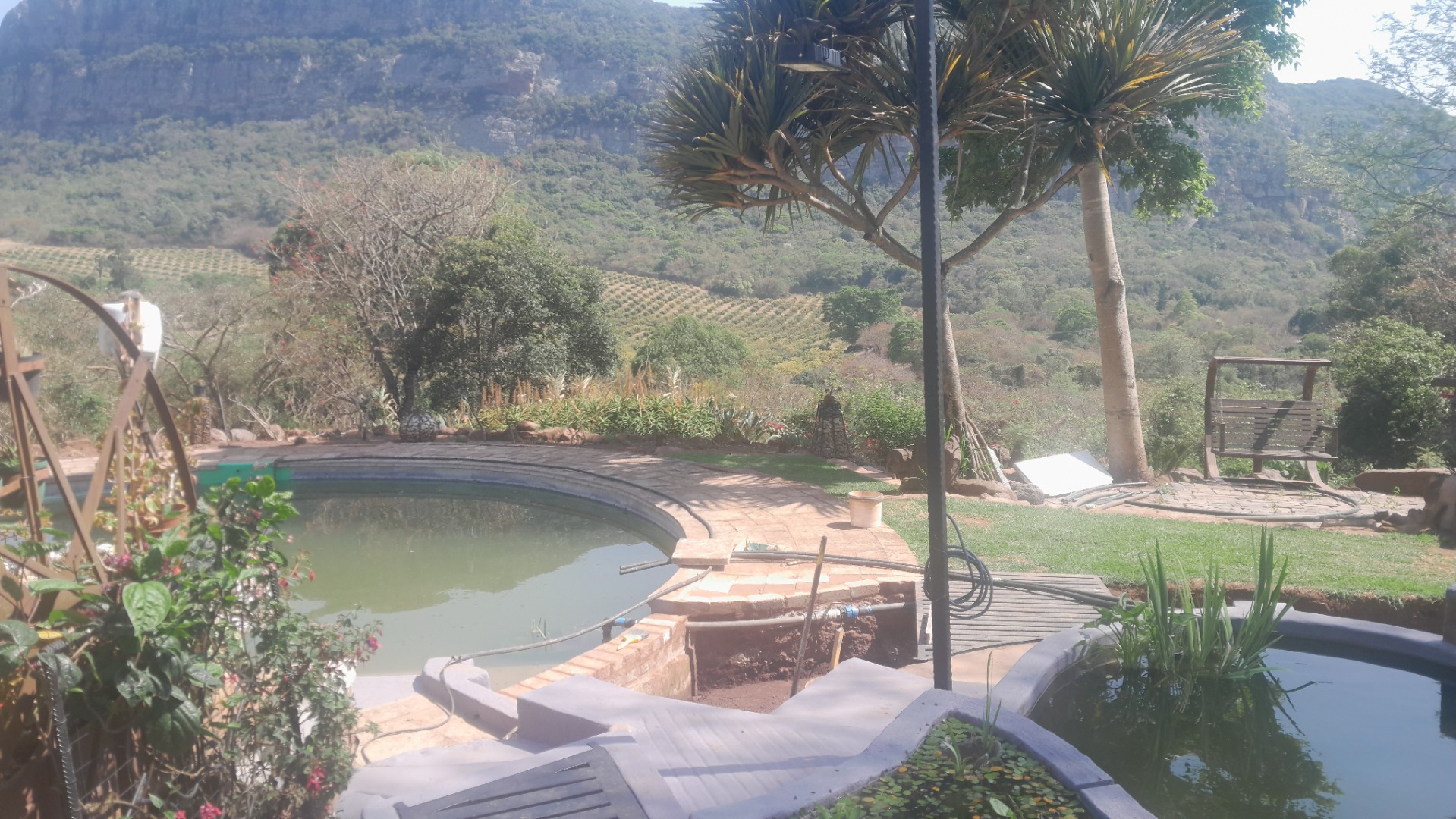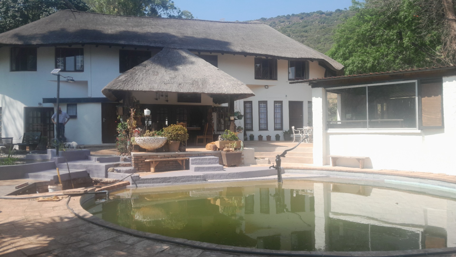 This distinctive residential property, nestled within a mountain estate in Louis Trichardt Rural, offers a unique blend of rustic charm and expansive potential. The multi-level main house boasts traditional thatch roofing and white walls, creating an inviting kerb appeal against a scenic mountain backdrop. This substantial home provides ample space for comfortable living and entertaining, making it an ideal family residence or a tranquil retreat in South Africa. The interior features a generous layout with six well-proportioned bedrooms and three bathrooms, all of which are en-suite, ensuring privacy and convenience. The home includes a dedicated lounge, a dining room, and a functional kitchen, which showcases rustic elements like exposed brick and wooden cabinetry, hinting at a warm, traditional aesthetic. Natural light floods the living spaces through large windows. Outdoor living is a significant highlight, with extensive multi-level patios, a covered veranda, and a dedicated thatched lapa, perfect for entertaining or quiet relaxation. The property sits on a vast 5.00-hectare erf, offering considerable space and privacy. While the large swimming pool and interconnected water features currently require maintenance, they present an incredible opportunity to create a stunning outdoor oasis. Six parking spaces are available. Further enhancing its appeal, the property includes a solar panel, contributing to potential energy efficiency. The estate setting, combined with breathtaking mountain views and lush natural landscaping, provides a serene and picturesque environment. This Louis Trichardt gem is poised for a discerning buyer ready to unlock its full potential and embrace a lifestyle of peace and natural beauty. Key Features: * Unique thatch-roof architecture * Six bedrooms, three en-suite bathrooms * Spacious lounge, dining room, and kitchen * Extensive multi-level patios and covered veranda * Dedicated thatched lapa for outdoor entertaining * Large 5.00-hectare erf with mountain views * Six dedicated parking spaces * Includes a solar panel