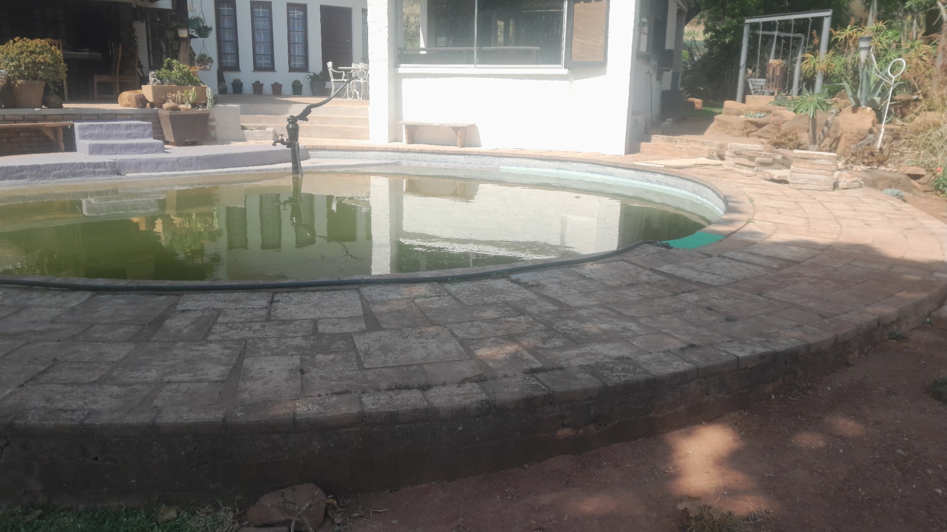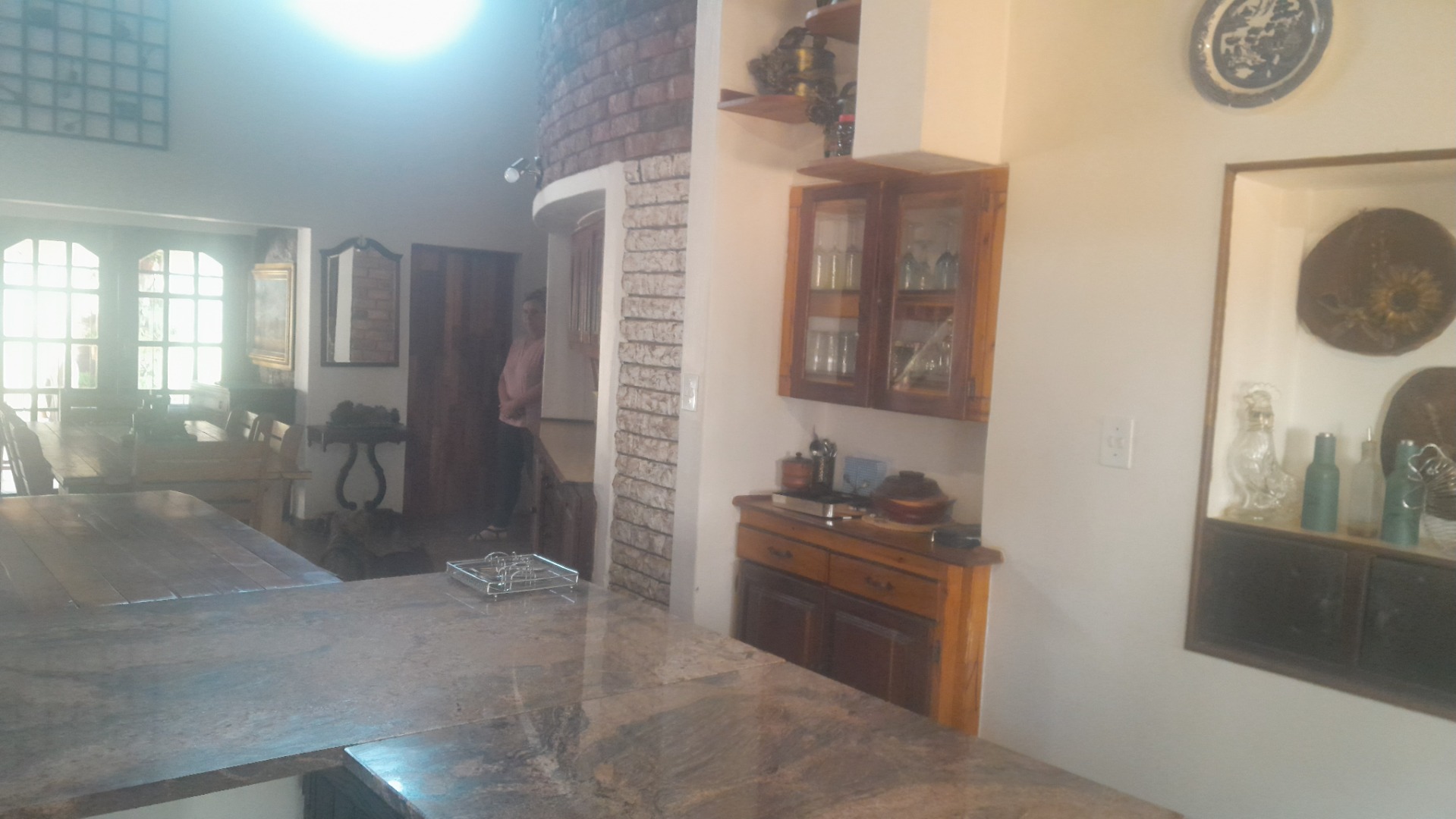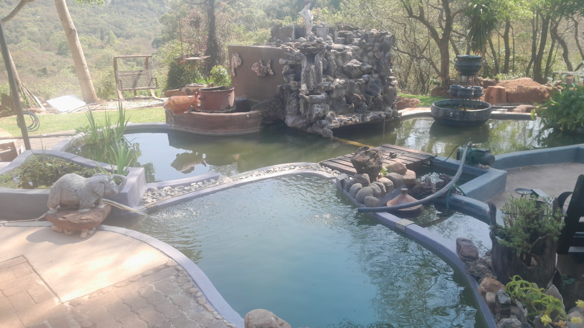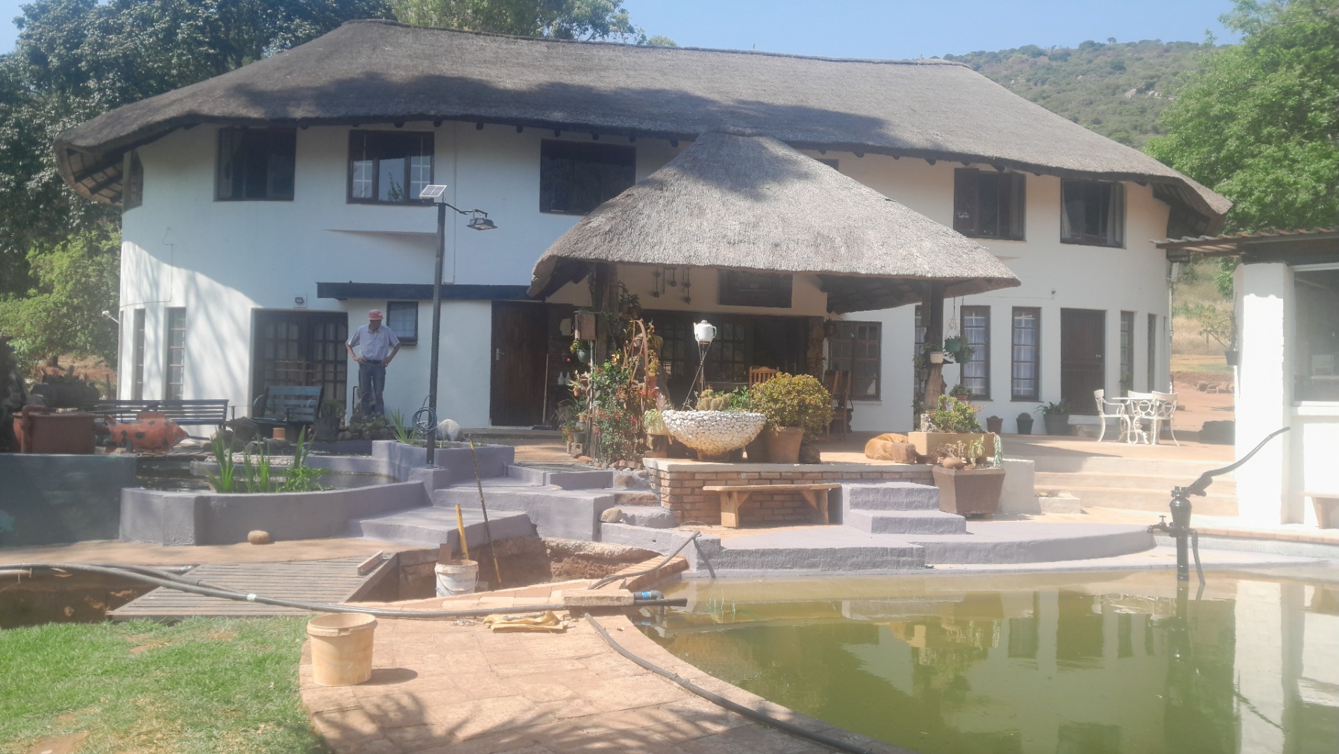 This distinctive residential property, nestled within a mountain estate in Louis Trichardt Rural, offers a unique blend of rustic charm and expansive potential. The multi-level main house boasts traditional thatch roofing and white walls, creating an inviting kerb appeal against a scenic mountain backdrop. This substantial home provides ample space for comfortable living and entertaining, making it an ideal family residence or a tranquil retreat in South Africa. The interior features a generous layout with six well-proportioned bedrooms and three bathrooms, all of which are en-suite, ensuring privacy and convenience. The home includes a dedicated lounge, a dining room, and a functional kitchen, which showcases rustic elements like exposed brick and wooden cabinetry, hinting at a warm, traditional aesthetic. Natural light floods the living spaces through large windows. Outdoor living is a significant highlight, with extensive multi-level patios, a covered veranda, and a dedicated thatched lapa, perfect for entertaining or quiet relaxation. The property sits on a vast 5.00-hectare erf, offering considerable space and privacy. While the large swimming pool and interconnected water features currently require maintenance, they present an incredible opportunity to create a stunning outdoor oasis. Six parking spaces are available. Further enhancing its appeal, the property includes a solar panel, contributing to potential energy efficiency. The estate setting, combined with breathtaking mountain views and lush natural landscaping, provides a serene and picturesque environment. This Louis Trichardt gem is poised for a discerning buyer ready to unlock its full potential and embrace a lifestyle of peace and natural beauty. Key Features: * Unique thatch-roof architecture * Six bedrooms, three en-suite bathrooms * Spacious lounge, dining room, and kitchen * Extensive multi-level patios and covered veranda * Dedicated thatched lapa for outdoor entertaining * Large 5.00-hectare erf with mountain views * Six dedicated parking spaces * Includes a solar panel