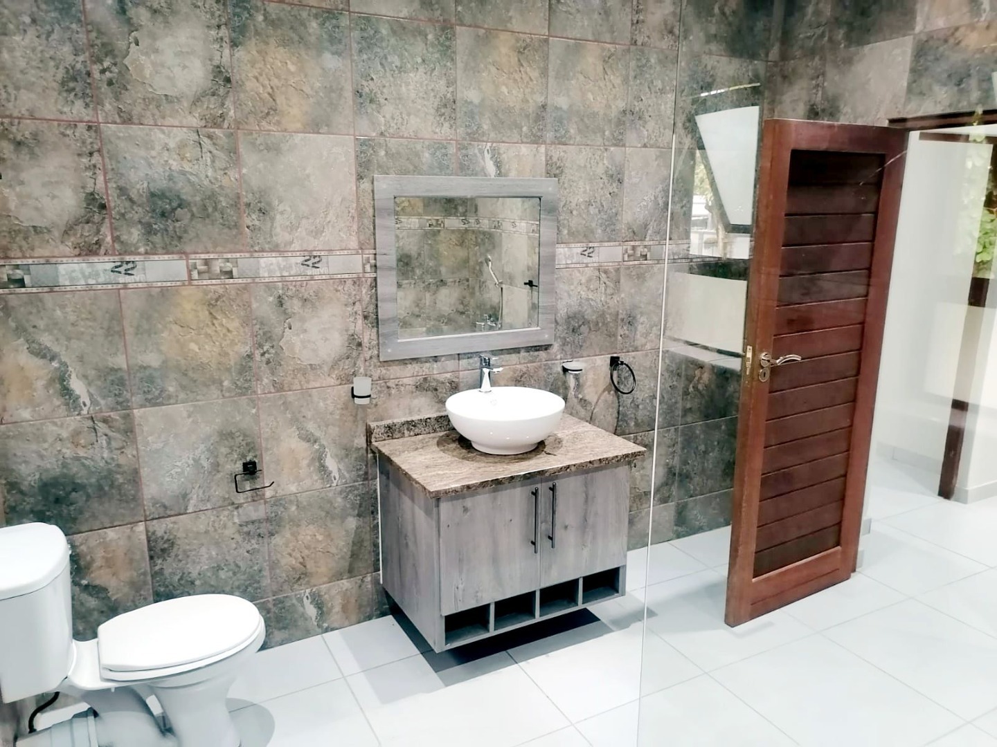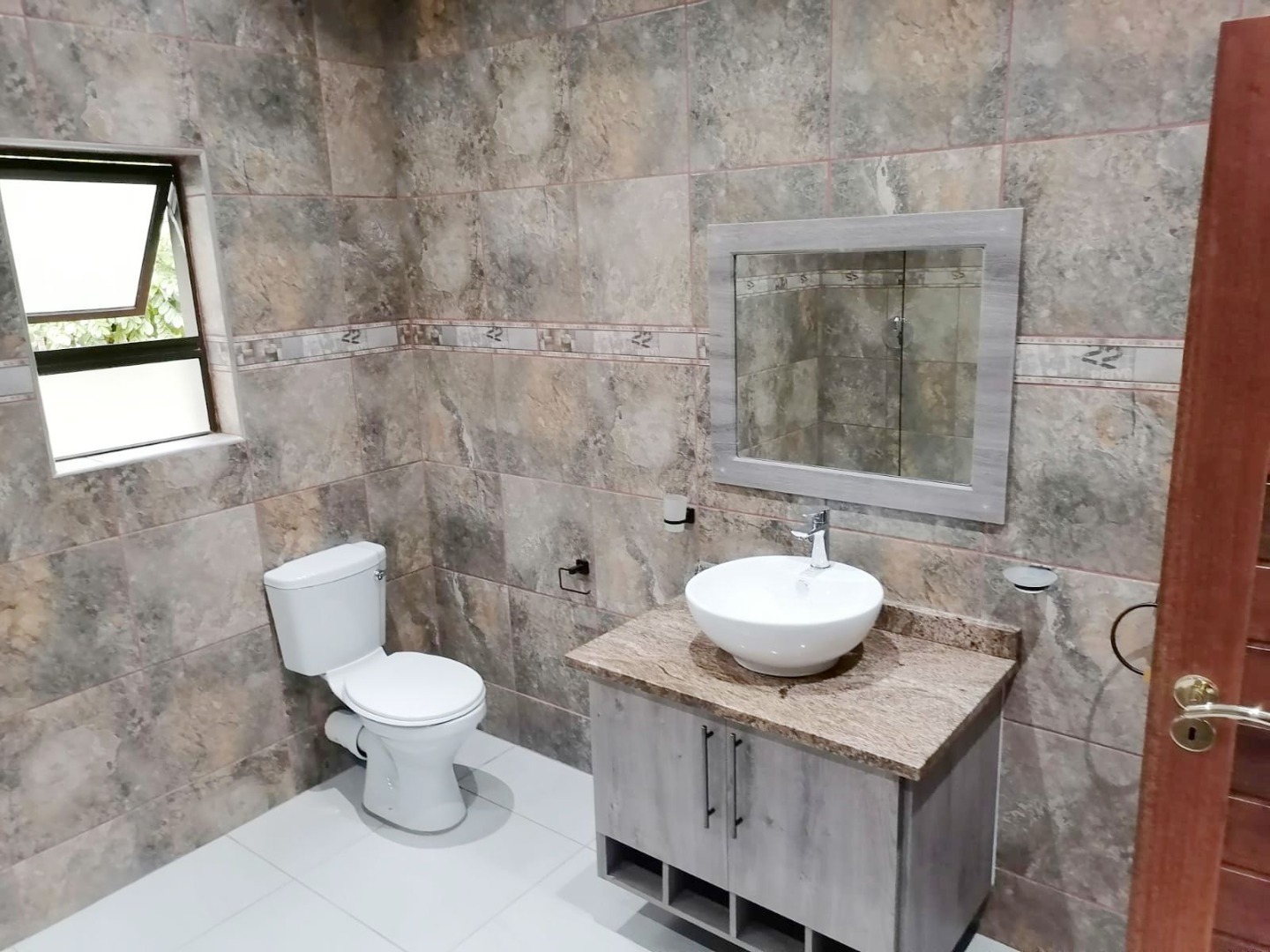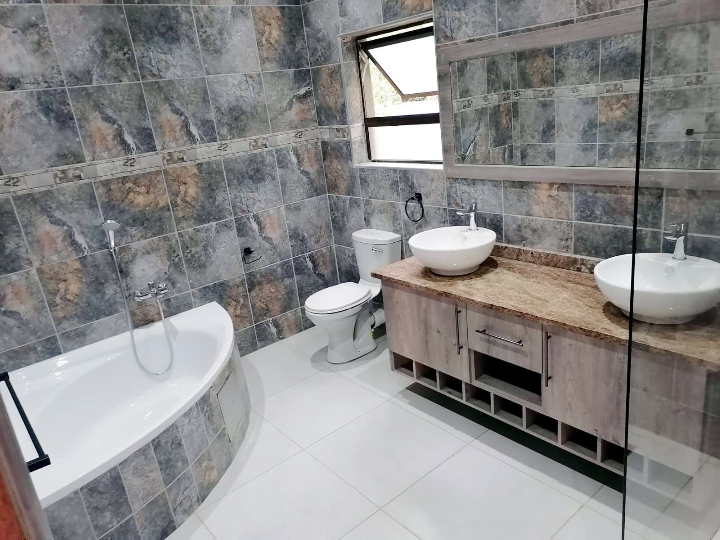 The bathrooms are neat with granite tops and fitted with a bath, shower and toilet.